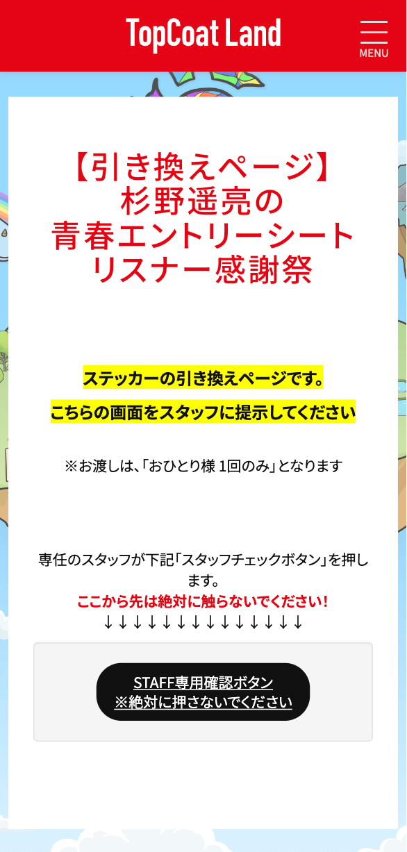 ①3月21日(土)に<江戸川区総合文化センター 大ホール ロビーTopCoat Land施策ブース>にて、下記引き換えページをタップし、未ログインの方はログインをした状態でスタッフに下記画面をお見せください。